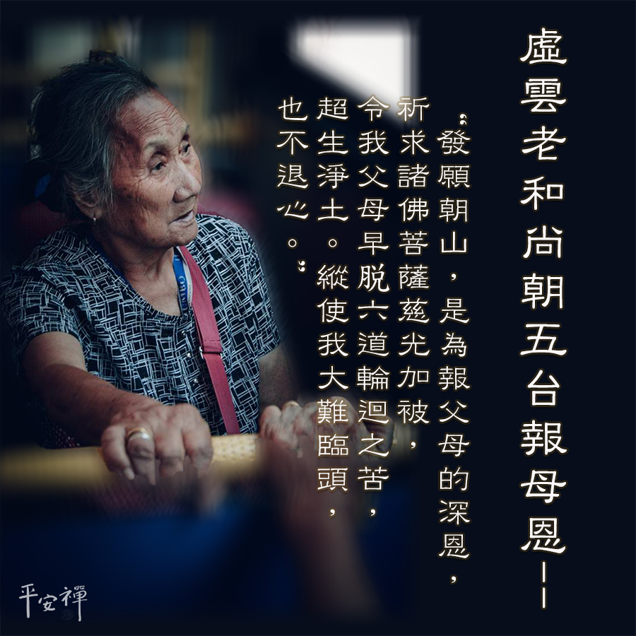 虛雲法師說︰「先生美意可感,但我出世不見母親,母為生我而死,父僅得我一子,我竟背父而逃,父因我而辭官,而促壽,昊天罔極,耿耿數十年矣,特此發願朝山,求菩薩加被,願我父母脫苦,早生淨土。任他百難當前,非到聖境,死亦不敢退願也。」